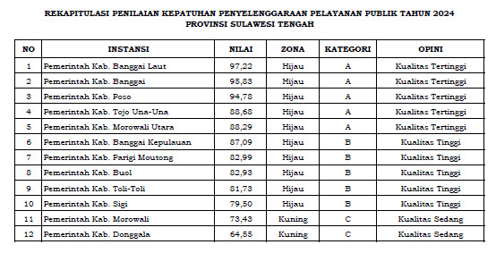 Hasilnya Banggai Laut memperoleh zona Hijau dalam Kategori A yakni dengan Kualitas Tertinggi di angka 97.22. Angka itu merupakan angka tertinggi dari semua Kabupaten Kota/ Provinsi Sulawesi Tengah.